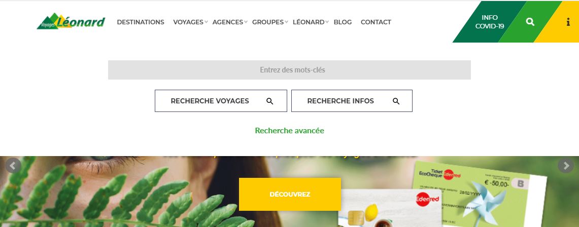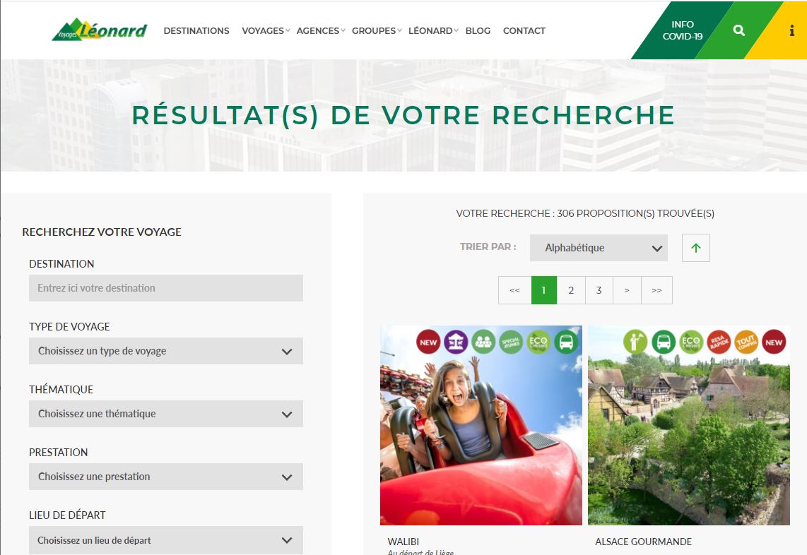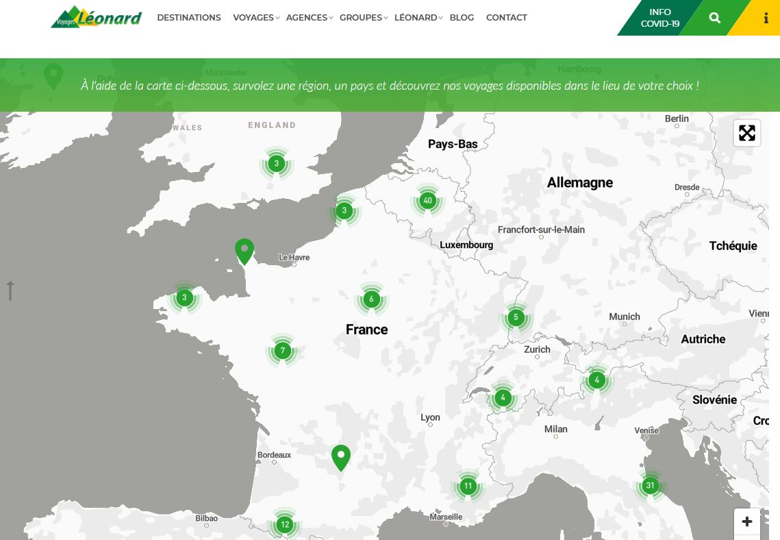 Vous préférez parcourir la carte pour trouver votre voyage, rendez-vous au milieu de la homepage (www.voyages-leonard.com). Vous trouverez une carte interactive. Le nombre de voyages par région est identifié par un numéro. Cliquez sur le numéro et découvrez les voyages proposés. Les Vacances en voiture ne sont pas reprises sur cette carte.