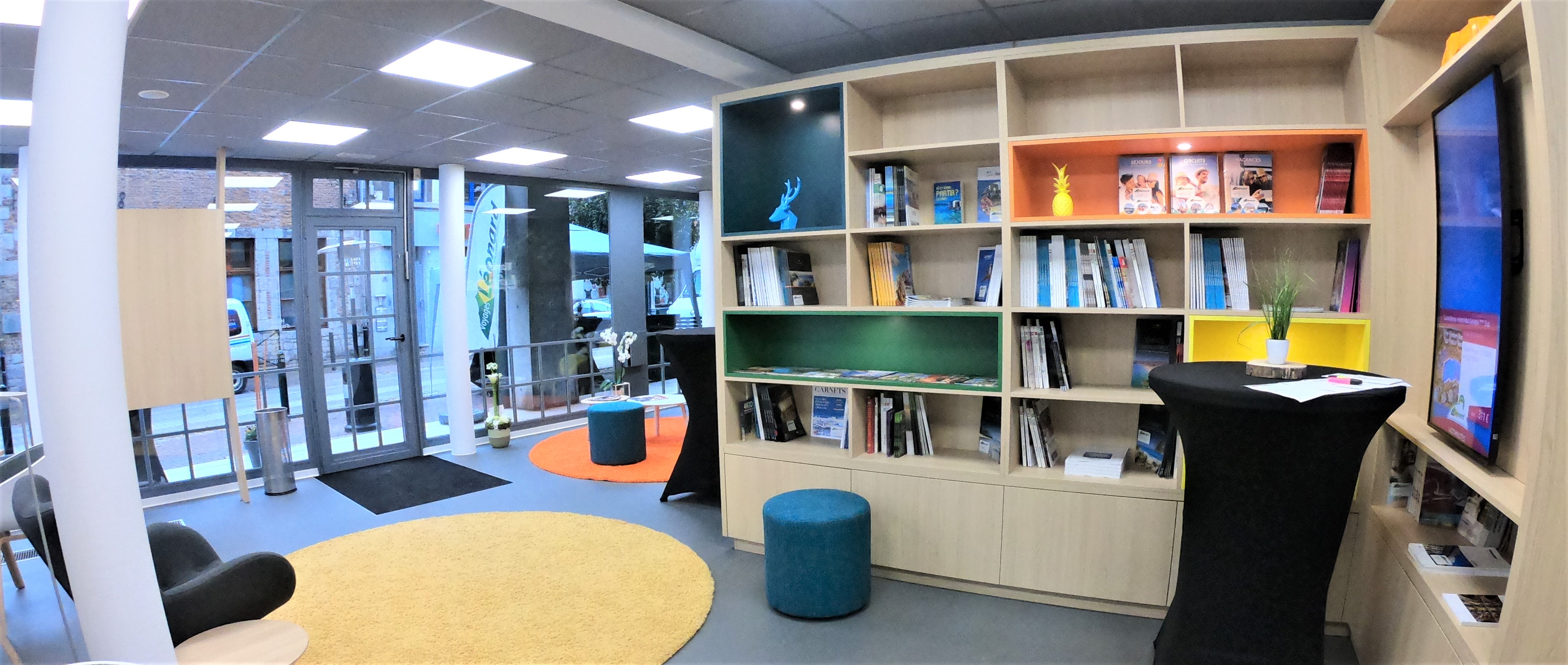Réinventer l’expérience client au sein d’une agence de voyages, c’était le défi de Voyages Léonard en réaménageant leurs locaux de Marche. L’une des premières préoccupations était de gérer l’attente. Le client y est de moins en moins disposé. Il fallait donc la rendre la plus agréable possible. Deux options s’offrent au visiteur : soit il patiente dans un salon confortablement assis et équipé du wifi, soit il peut déambuler dans la « bibliothèque-voyages » où brochures, livres et photos de voyages sont à sa disposition pour l’inspirer dans le choix de sa prochaine destination de vacances. Une fois son tour venu, un conseiller-voyages l’accompagnera dans le choix de ses vacances, le conseillera et l’assistera dans ses démarches de réservations. Lumineux, chaleureux et inspirant, le design a été réfléchi pour rassurer et apaiser. L’objectif était que le client se sente "comme à la maison" et les premiers retours portent à croire que cet objectif est atteint.