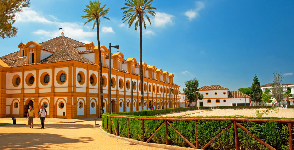 Ville connue des initiés pour son circuit de courses motocyclistes, pour son vin, le Xeres, mais aussi et surtout pour son Centre Royal Andalou des Arts Equestres. Et c’est là que commence notre journée. Une hôtesse locale nous fait d’abord découvrir le centre dans tous ses recoins : haras, sellerie, expos diverses d’attelages, de vêtements, etc. A midi, plus de mille personnes s’installent dans le grand manège pour un spectacle magnifique montrant les résultats du dressage des chevaux. Splendide !
