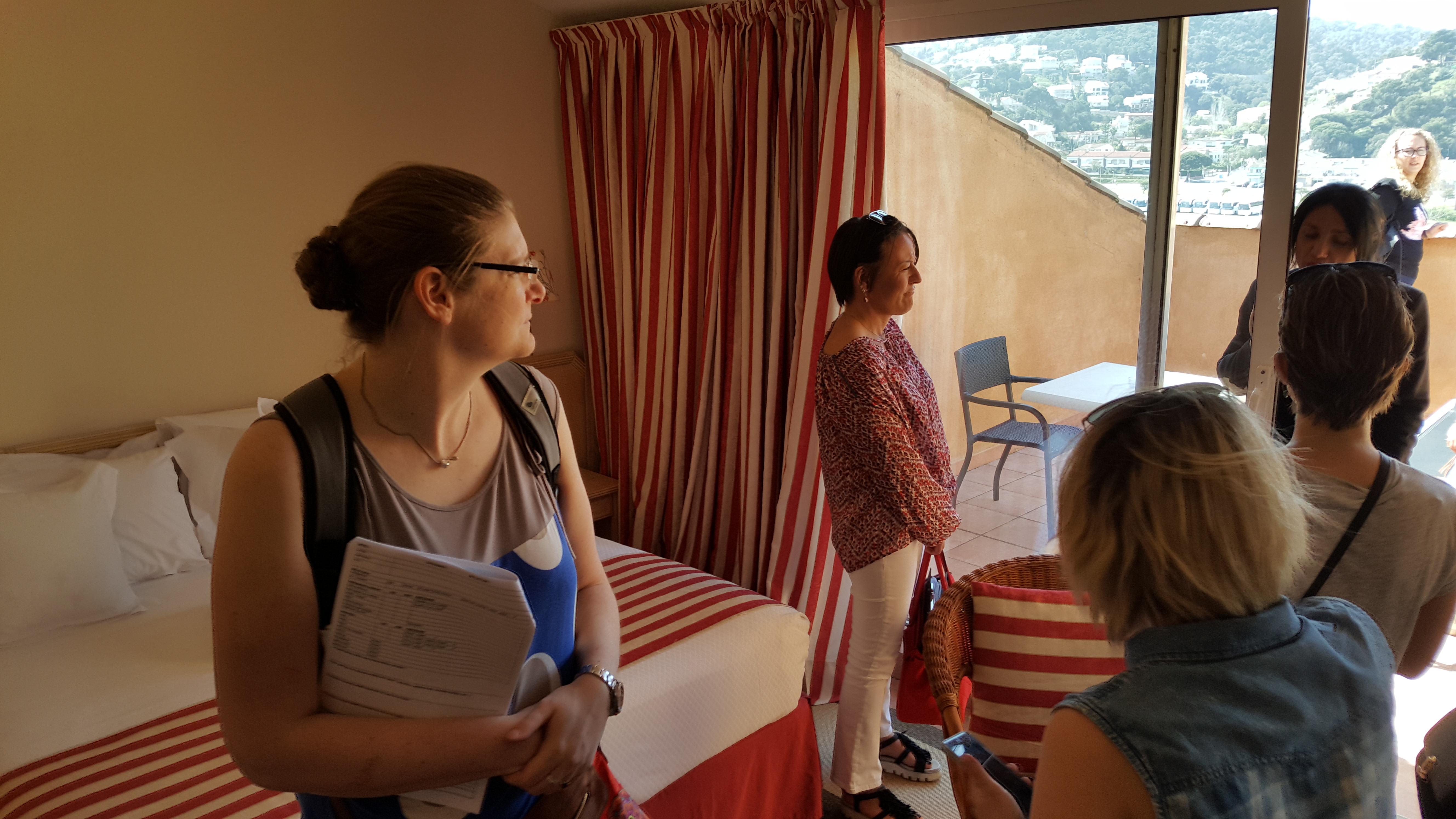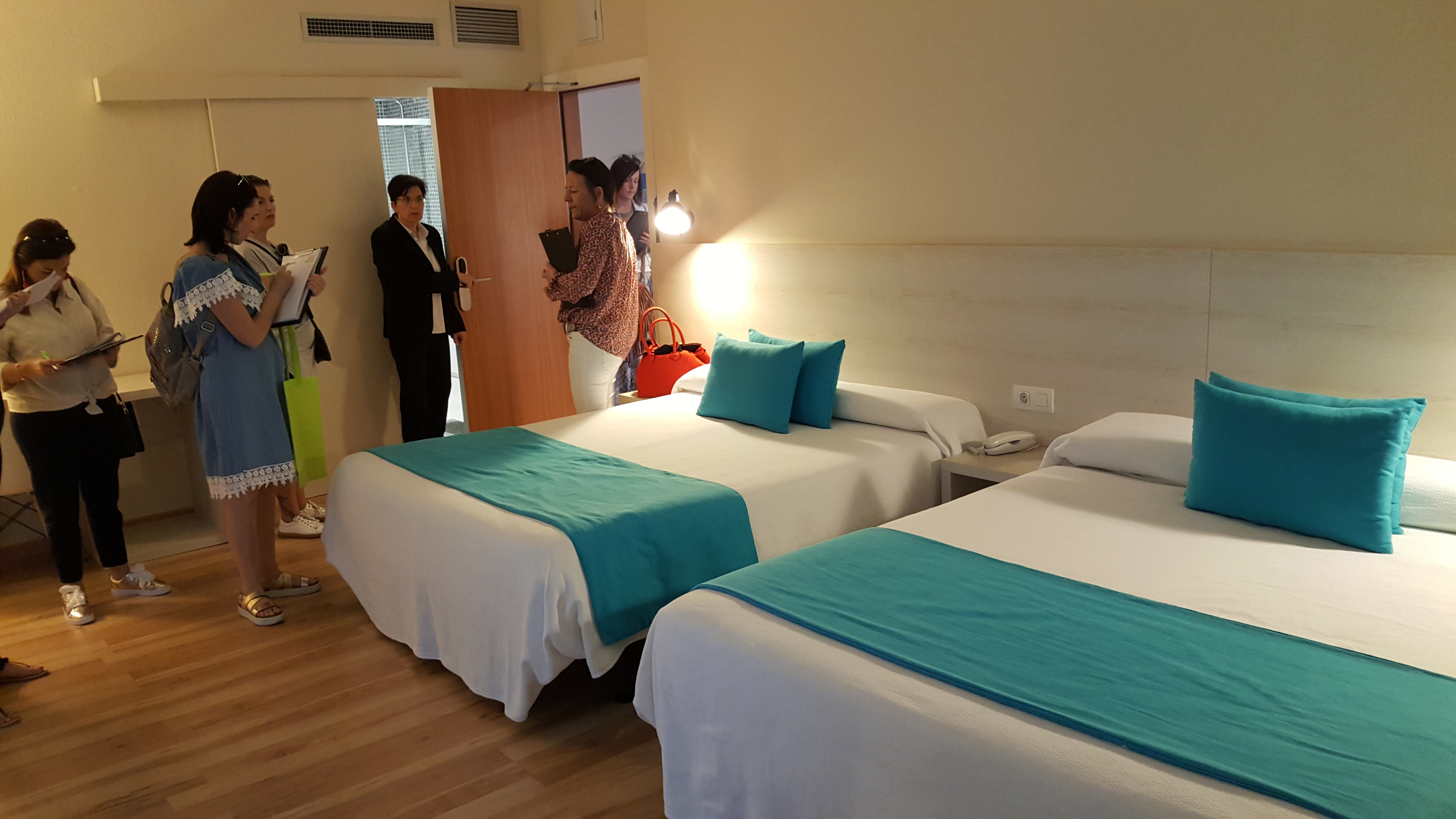 C’est parti ! Nous visitons les 10 premiers hôtels du séjour. Les rencontres s’enchaînent avec les responsables hôteliers. Nos intérêts se portent sur l’accueil, les chambres, les piscines, le bar, le restaurant, etc. Les questions fusent sur les types de chambres, les prix des options (frigo, coffre, wifi), la présence et le nombre de chambres pour personnes à mobilité réduite, les animations, les heures d’ouverture du restaurant, les types de pension, la présence d’un spa, etc. Tous les aspects y passent. Nos hôtes ont à peine le temps de respirer entre leurs réponses. Rien ne doit être oublié. La qualité des conseils à la clientèle nous l’impose.